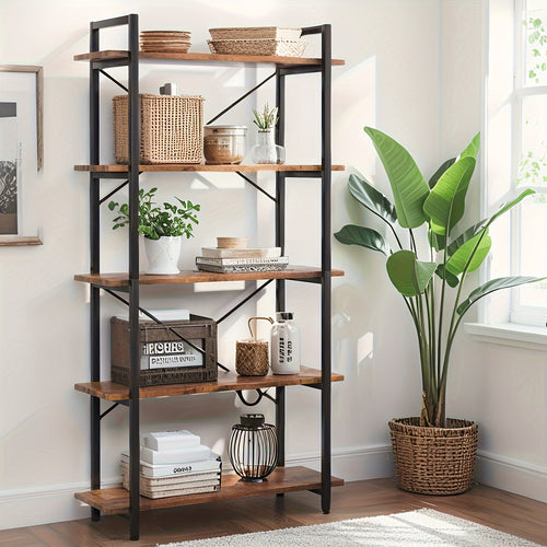 Five Layer Industrial Style Bookshelf - Retro Brown And Black Metal Frame, Stable Design, High-quality, Easy To Clean, Suitable For Offices, And Study Rooms - Easy To Assemble-Bookshelf -